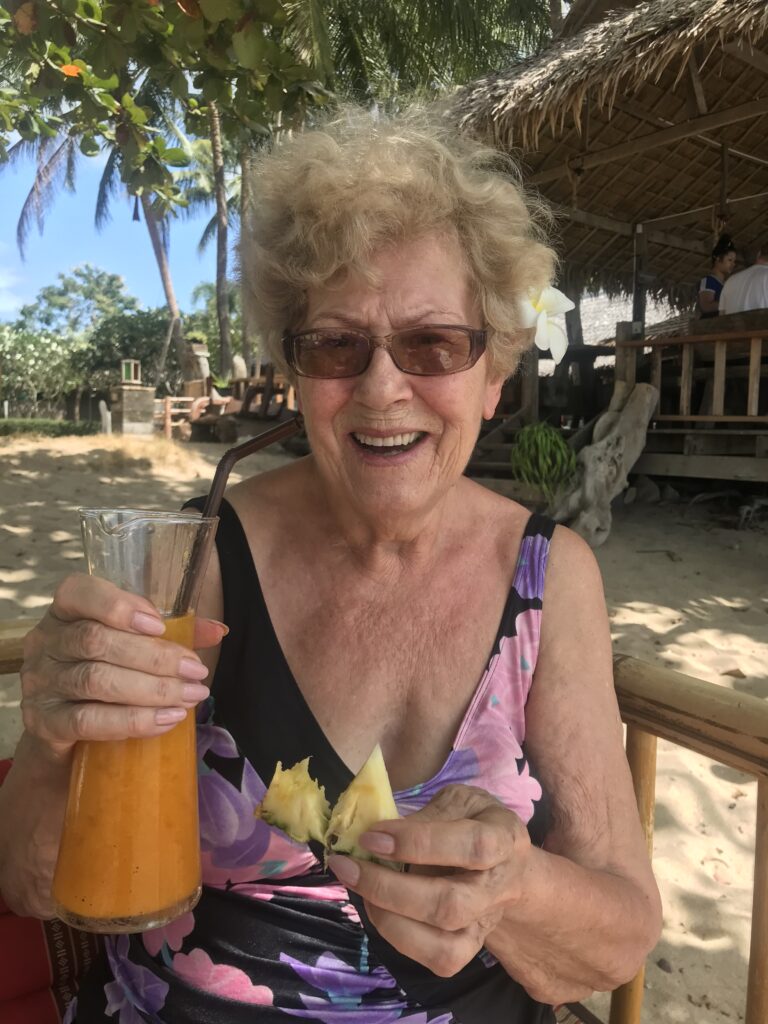 Babcia jechała disco taksówką, płynęła 2 promami, leciała 2 samolotami, jechała tuktukiem. Jadła tajskie jedzenie, próbowała egzotycznych owoców, brała witaminę D w postaci słońca, poprawiła swoją skórę, która stała się nawilżona i błyszcząca, poprawiła swoją kondycję spacerując i chodząc więcej niż robiła to będąc w Polsce. Uśmiech nie schodził jej z ust, stała się rozluźniona i…szczęśliwa.