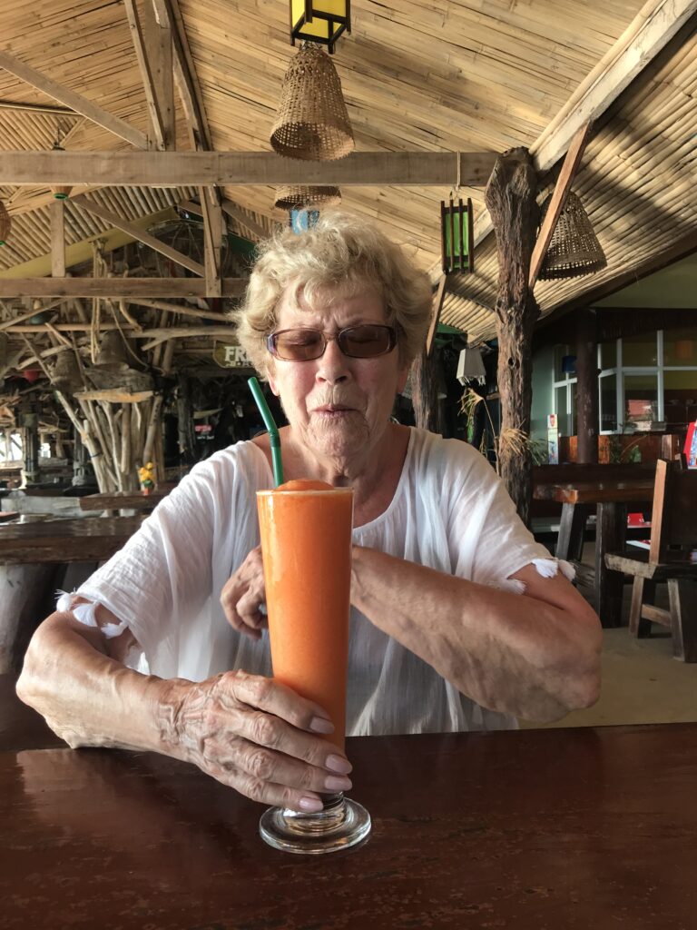 Babcia zjadła pierwsze tajskie posiłki, smakowały jej. Wypiła wodę kokosową – nie miała zdania. Była bardzo mile zaskoczona, że ludzie są uśmiechnięci i życzliwi.